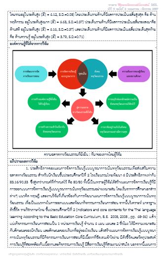 The results of the research found that 1) the efficiency of the teaching and learning activities by organizing integrated learning with an emphasis on multiculturalism to promote cultural intelligence. for grade 2 students at Ruam Thai Phatthana 6 School, the performance was 83.16/90.53, which is higher than the specified criteria of 80/80. 2) Cultural intelligence skills of Grade 2 students at Ruam Thai Phatthana 6 School. After studying with teaching activities by organizing integrated learning with an emphasis on multiculturalism to promote cultural intelligence. Overall, it was at a very high level (x ̅ = 4.71, S.D.=.16)